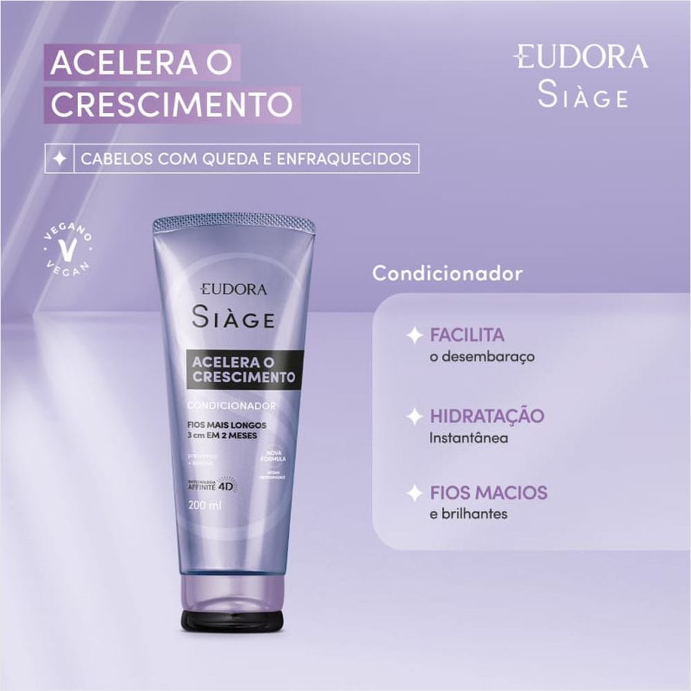 O Condicionador Siàge Acelera o Crescimento 200ml Eudora foi desenvolvido para auxiliar no crescimento saudável dos cabelos, sendo perfeito para quem sofre com queda e dificuldade de crescimento. Sua nova fórmula, altamente condicionante, facilita o desembaraço dos fios, promovendo hidratação instantânea e deixando os cabelos super macios e com brilho. Além de reduzir a queda, este condicionador também previne a queda natural, garantindo madeixas mais fortes e resistentes.