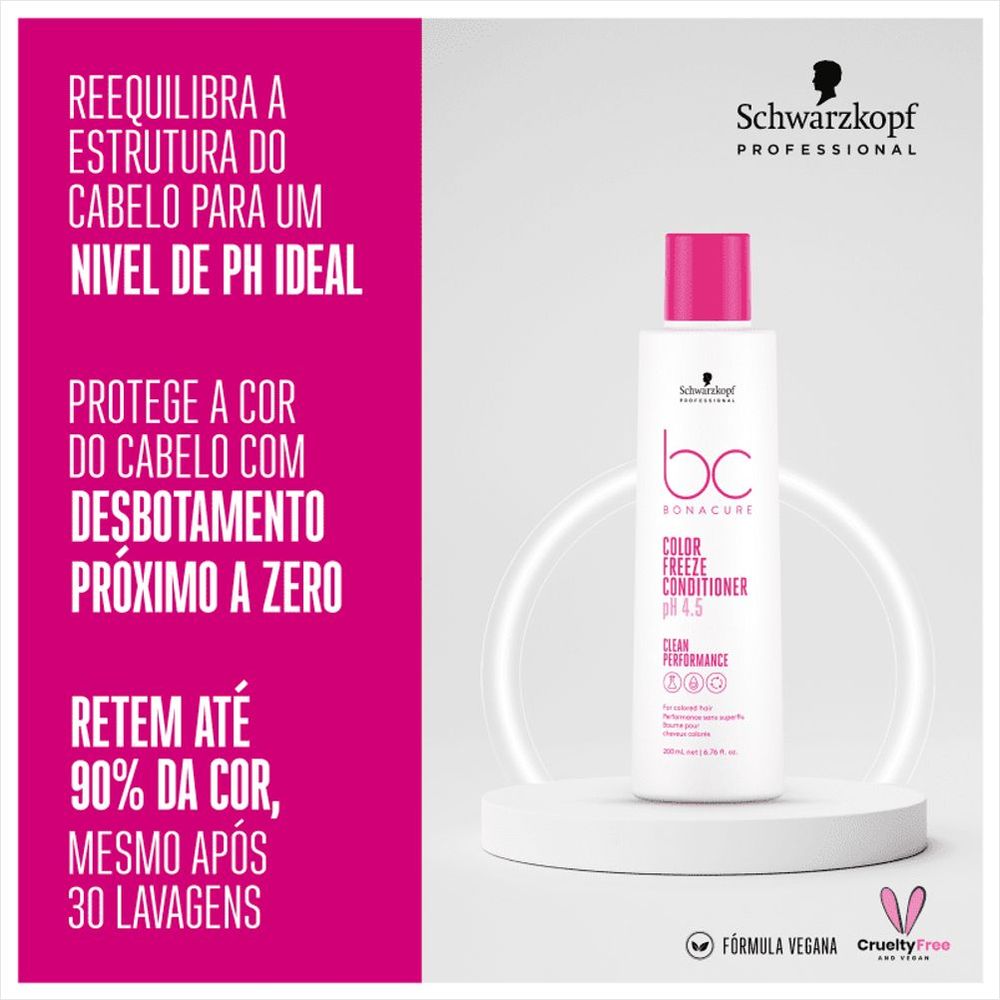 O Condicionador Bonacure Schwarzkopf Color Freeze é um produto de cuidado capilar desenvolvido especificamente para cabelos coloridos, descoloridos e com mechas. Sua fórmula inovadora, com a Tecnologia Equilibrante de pH 4.5, atua selando a cutícula capilar, otimizando o nível de pH ideal para fixar os pigmentos de cor e maximizar a retenção da coloração, prevenindo o desbotamento. Além de proteger a cor, este condicionador proporciona hidratação profunda, desembaraça os fios sem pesar, realça o brilho natural e ajuda a suavizar a superfície do cabelo, deixando-o macio, sedoso e vibrante por mais tempo. É o cuidado ideal para cabelos ligeiramente porosos que necessitam de atenção especial para manter a cor e a vitalidade.